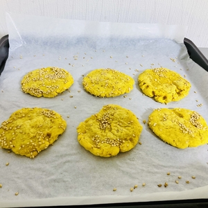 - Chia đều phần (2) ra thành các phần bằng nhau và tạo hình tuỳ ý. Rắc mè trắng lên trên mặt bánh và xếp vào khay nướng ( đã trải sẵn giấy nướng).