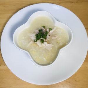 5. Cháo đậu xanh sau khi chín, sang cháo từ nồi cơm điện sang nồi khác, bắt lên bếp để lửa nhỏ. Vớt thịt gà ra, thái nhỏ tuỳ theo khả năng ăn thô của bé. Nêm nếm lại nồi cháo bằng gia vị cho vừa rồi tắt bếp.